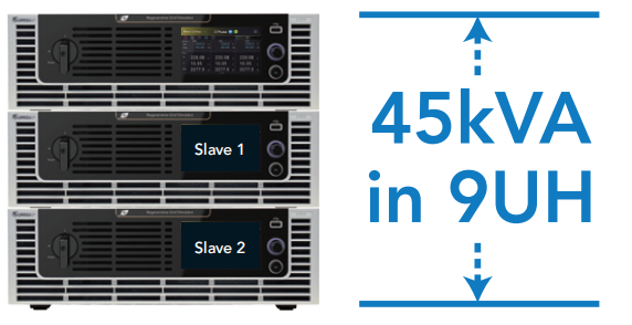 61809/61812/61815具备主从机(Master-Slave)并联输出功能,能以总并联台数最多三台来满足更高的输出功率需求。使用者可藉由连接三台61815回收式电网模拟电源,以一台主机加二台从机的并联构架,实现9U硬件高度内含总输出功率45kVA的高功率密度配置。