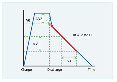 根据EDLC测试法规IEC 62391,同测试容量之步骤,EDLC必需确定 其经过CV充电程序并且已经完成充电后,其容量测试是以上述放 电电流进行CC放电,放电程序完成后,取放电曲线上线性的区域之 线段,并延申至放电之时间点取其与额定电压间之电压差与放电电 流,来计算DCIR值。