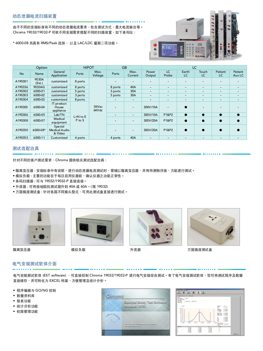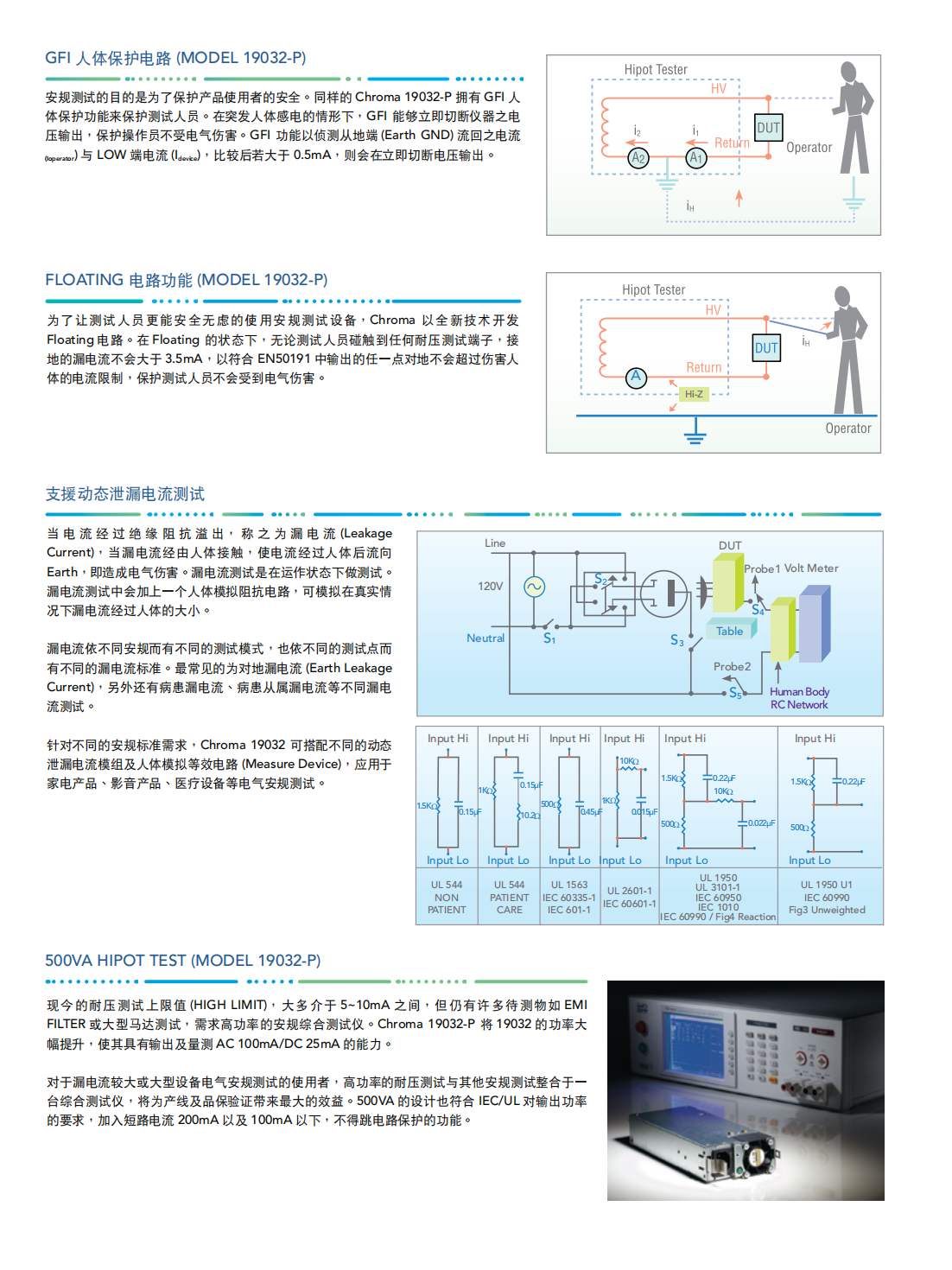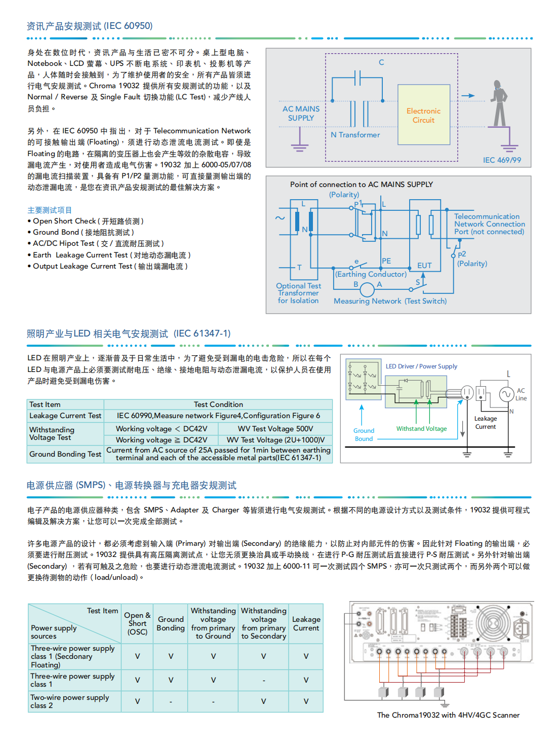 Chroma 19032系列结合耐压测试(Hi-Pot)、绝缘电阻测试(IR)、接地连接测试(GB)、动态泄漏电流测试(LC/LAC/LDC)以及动态功能测试(Function Test)。