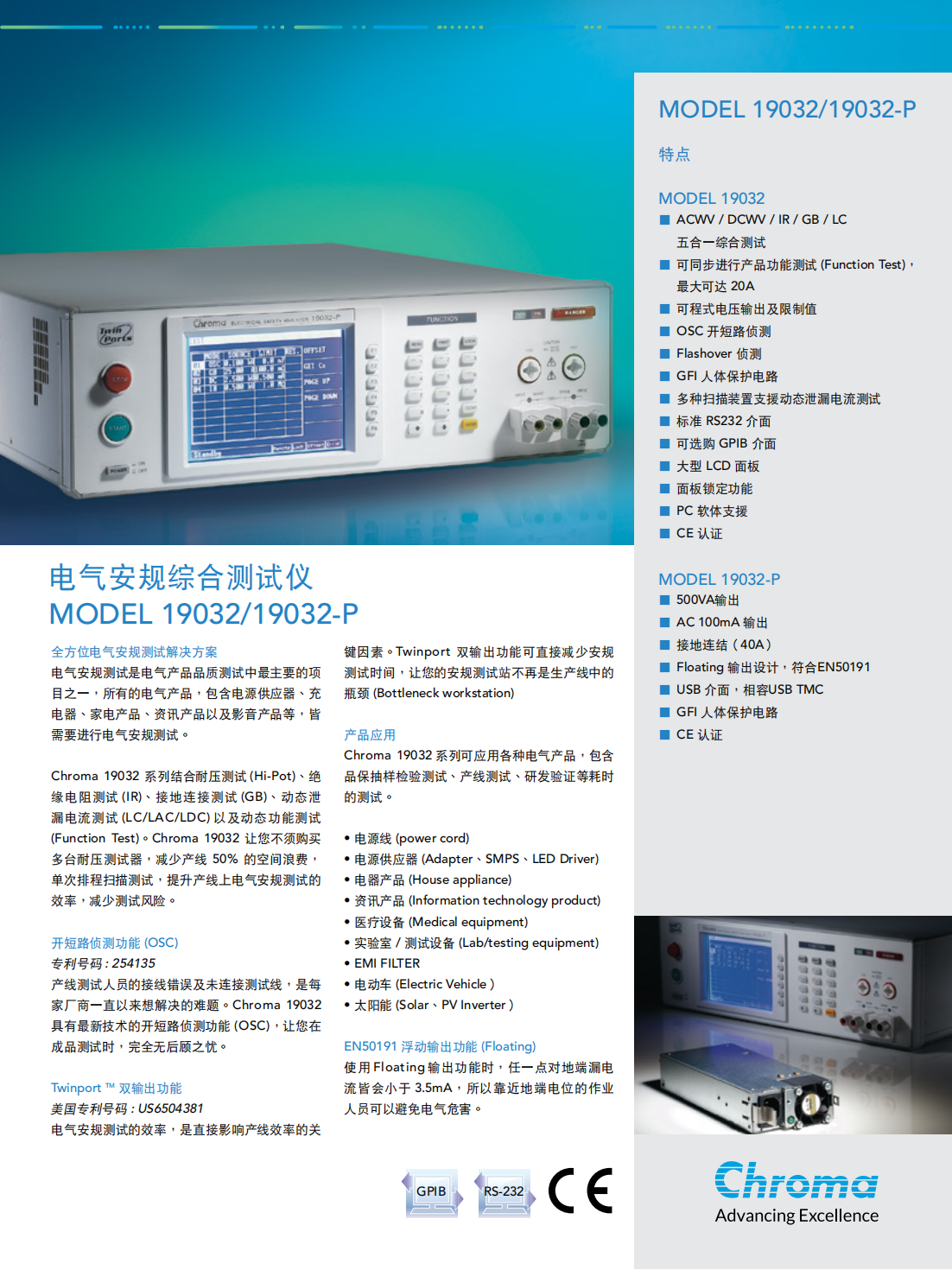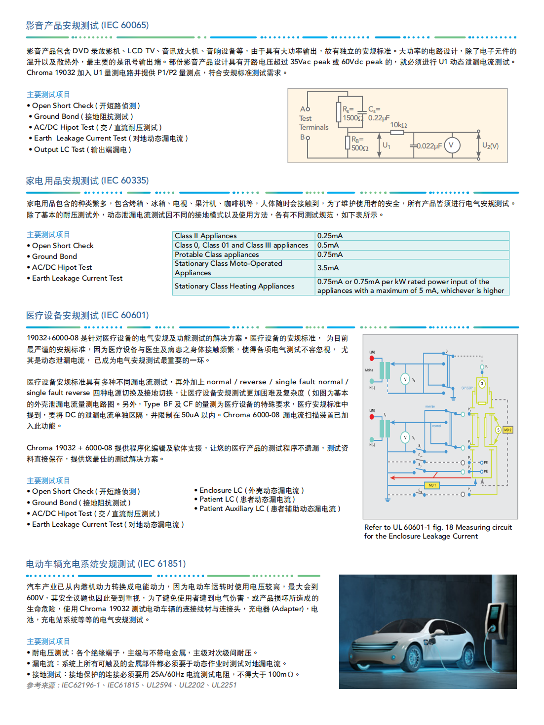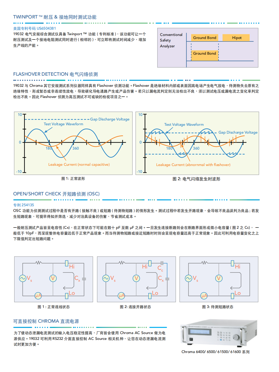 Chroma 19032系列结合耐压测试(Hi-Pot)、绝缘电阻测试(IR)、接地连接测试(GB)、动态泄漏电流测试(LC/LAC/LDC)以及动态功能测试(Function Test)。