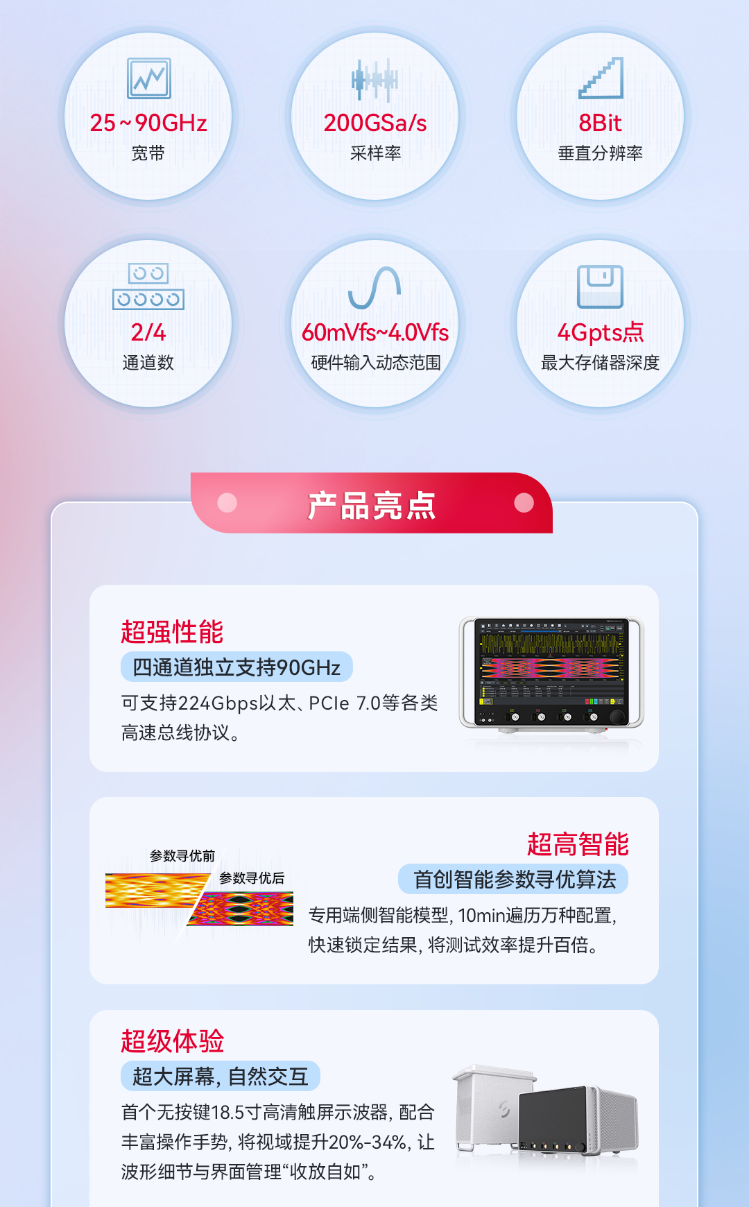 产品最大支持四个通道,每个通道均支持 90 GHz 模拟带宽和 200 GSa/s 实时采样率。